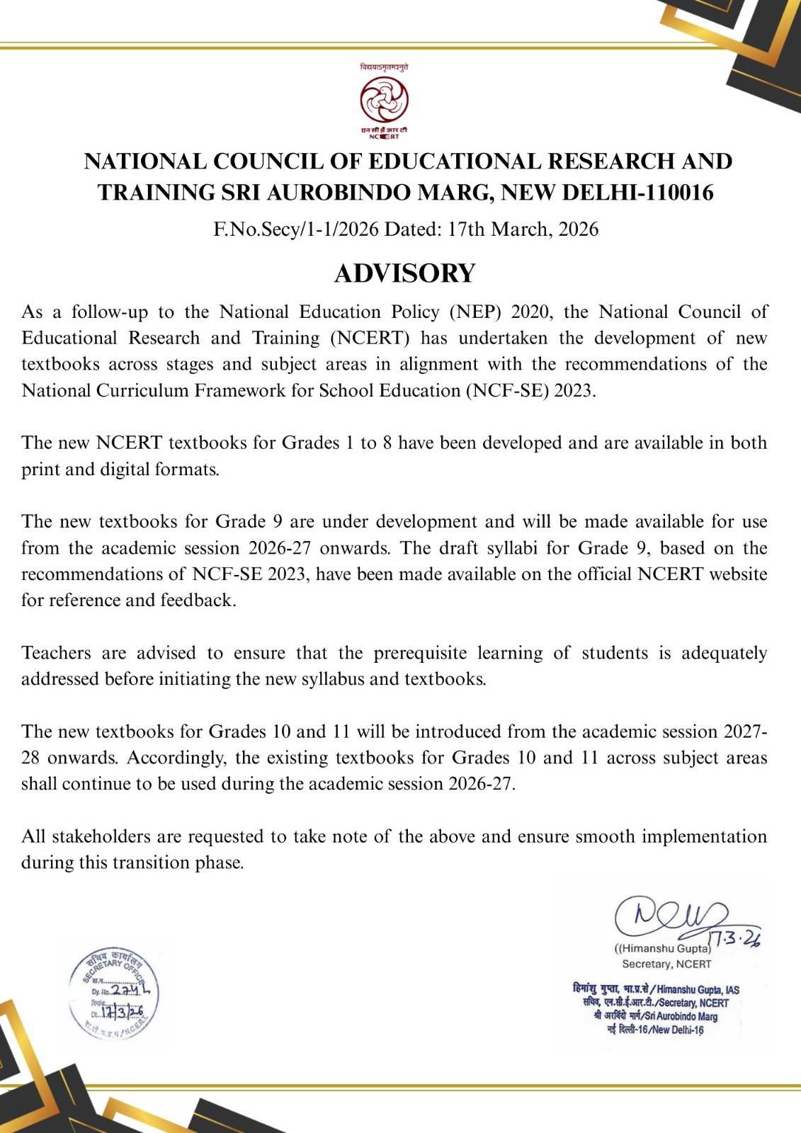 ఇక 10, 11 తరగతులకు కొత్త పుస్తకాలు 2027–28 నుంచి అమలులోకి వస్తాయని స్పష్టం చేశారు. అప్పటివరకు పాత పాఠ్యపుస్తకాలనే కొనసాగించాల్సి ఉంటుంది. ఈ మార్పుల నేపథ్యంలో ఉపాధ్యాయులు ముందస్తు జ్ఞానాన్ని బలపరచాలని ఎన్సీఈఆర్టీ సూచించింది.